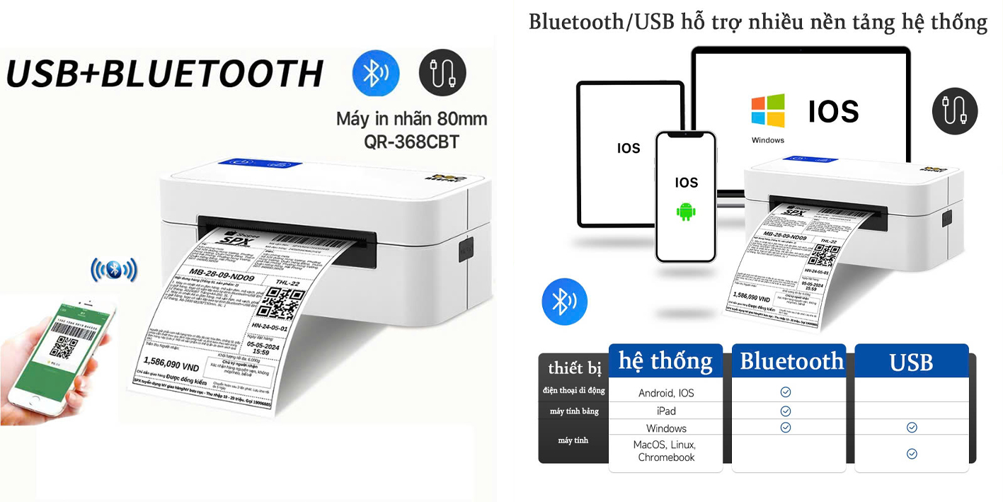 Máy in mã vạch QR-368CBT kết nối linh hoạt với nhiều thiết bị khác nhau. Máy hỗ trợ cả cổng USB và Bluetooth, cho phép người dùng dễ dàng kết nối với máy tính, điện thoại hoặc máy tính bảng mà không gặp khó khăn